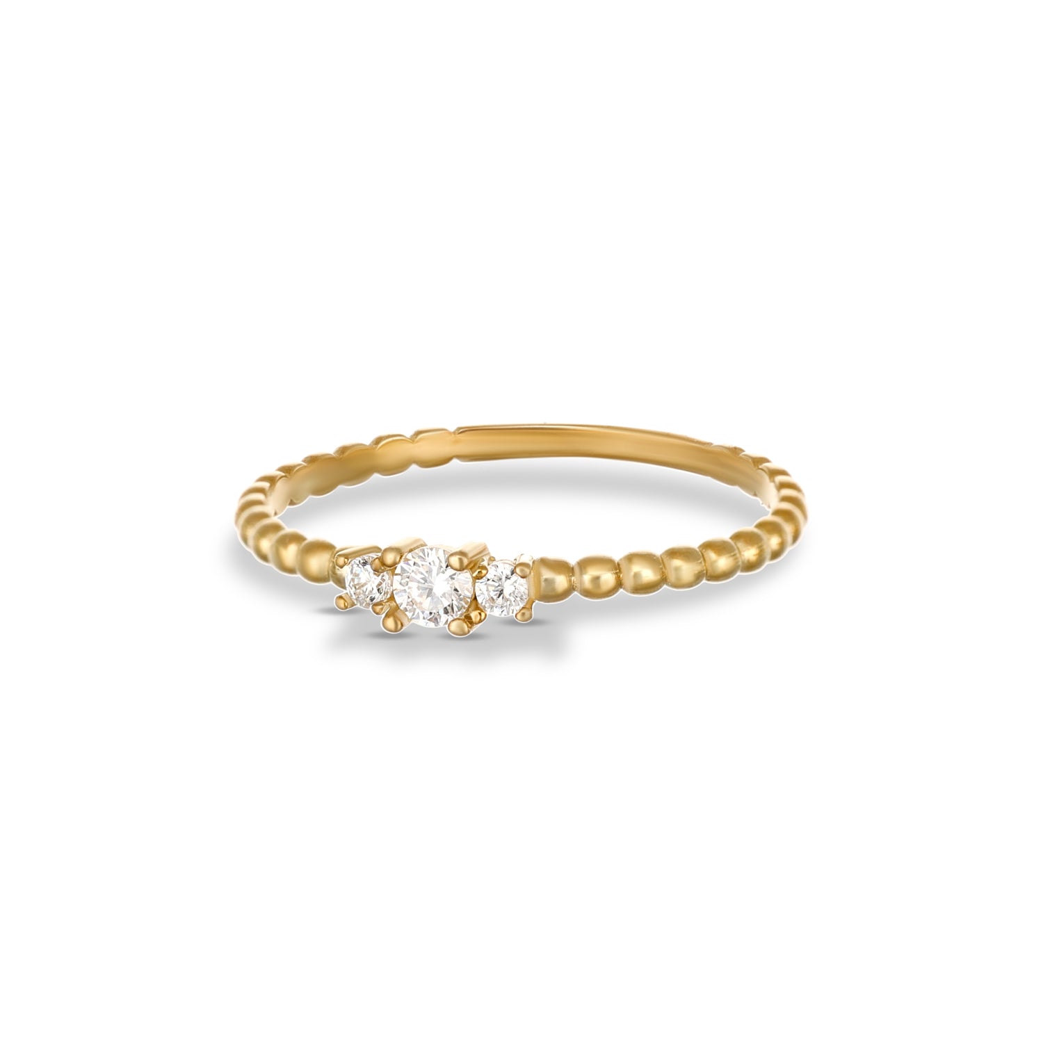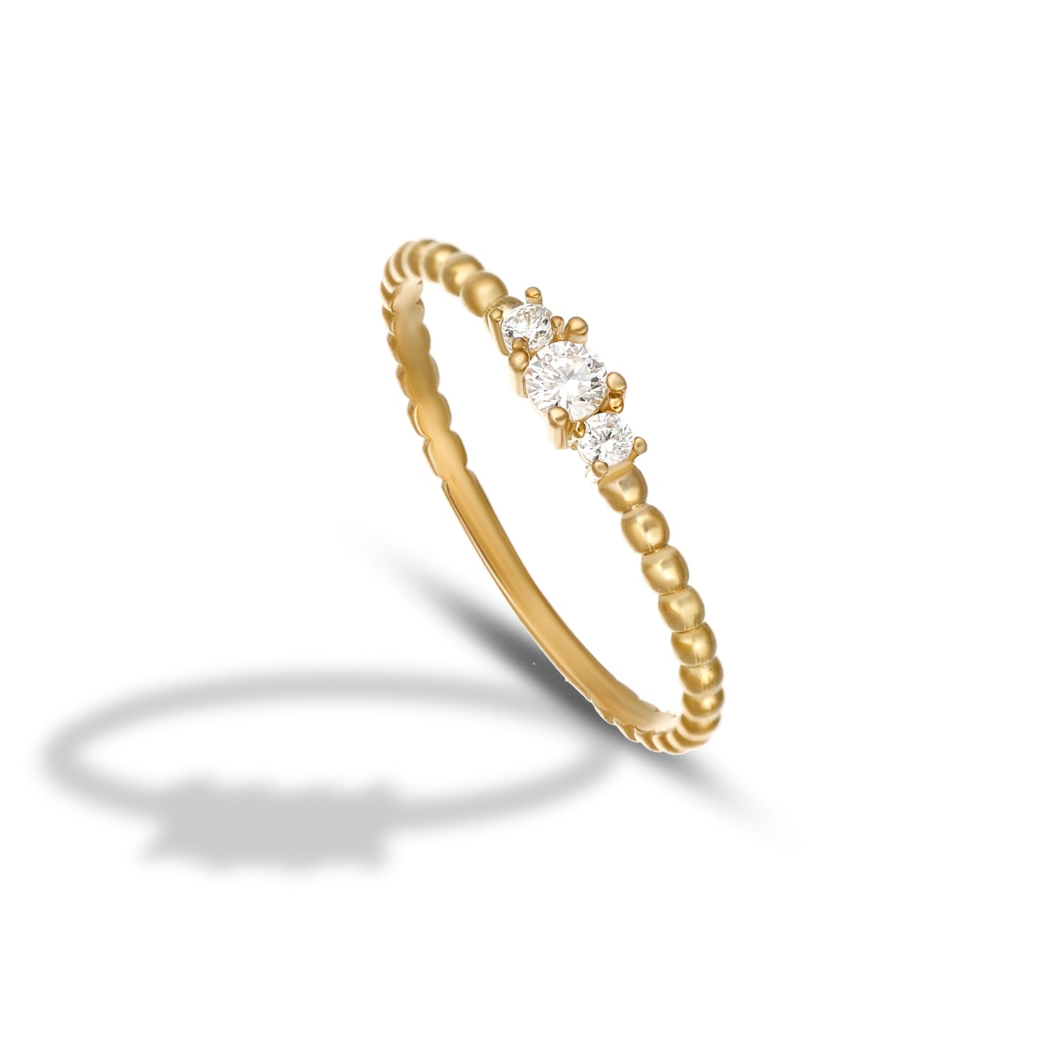Three white zirconia stones, 2 and 3 mm, in perfect graduated balance illuminate the 9-karat gold ball-polished shank, creating an elegant and sophisticated jewel.