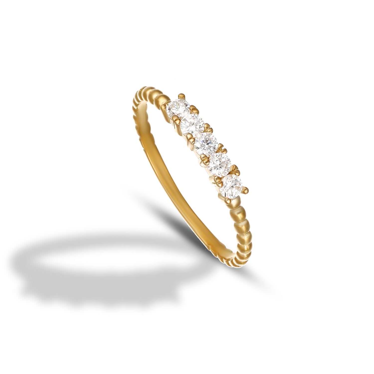 Five 2mm white zirconia stones, harmoniously arranged on the 9 Carat Dana L'Or ball-cut shank, add brilliance and character to an essential and refined design.