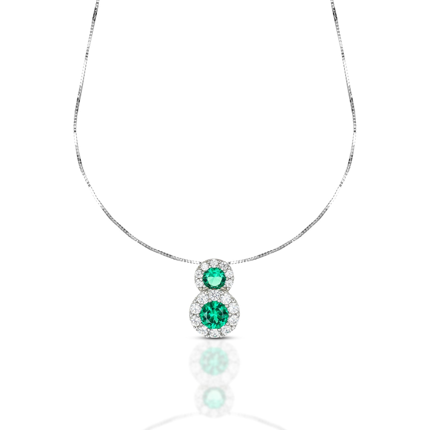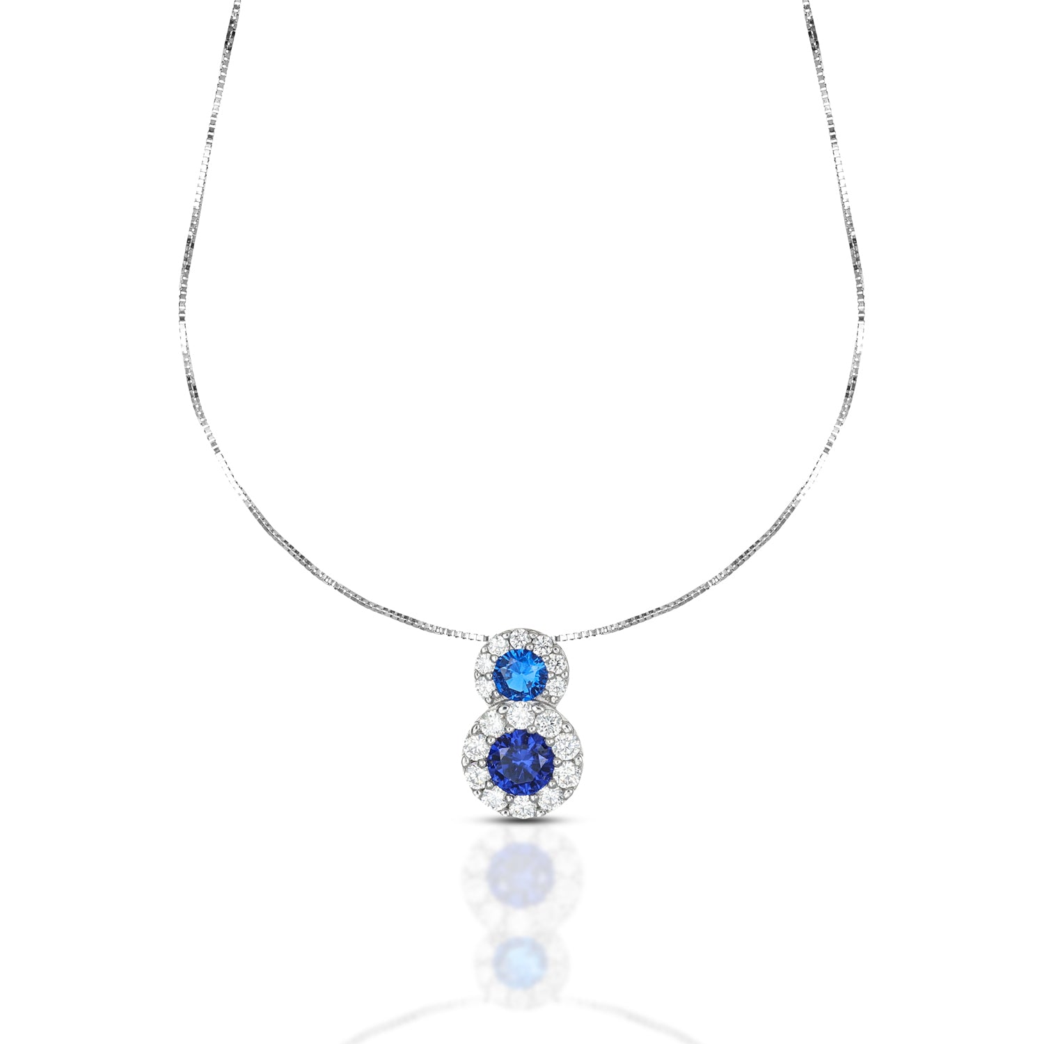 Crafted from 9-karat gold, it features a double-round pendant embellished with zirconia and non-precious natural stones in shades of white, red, green and blue.