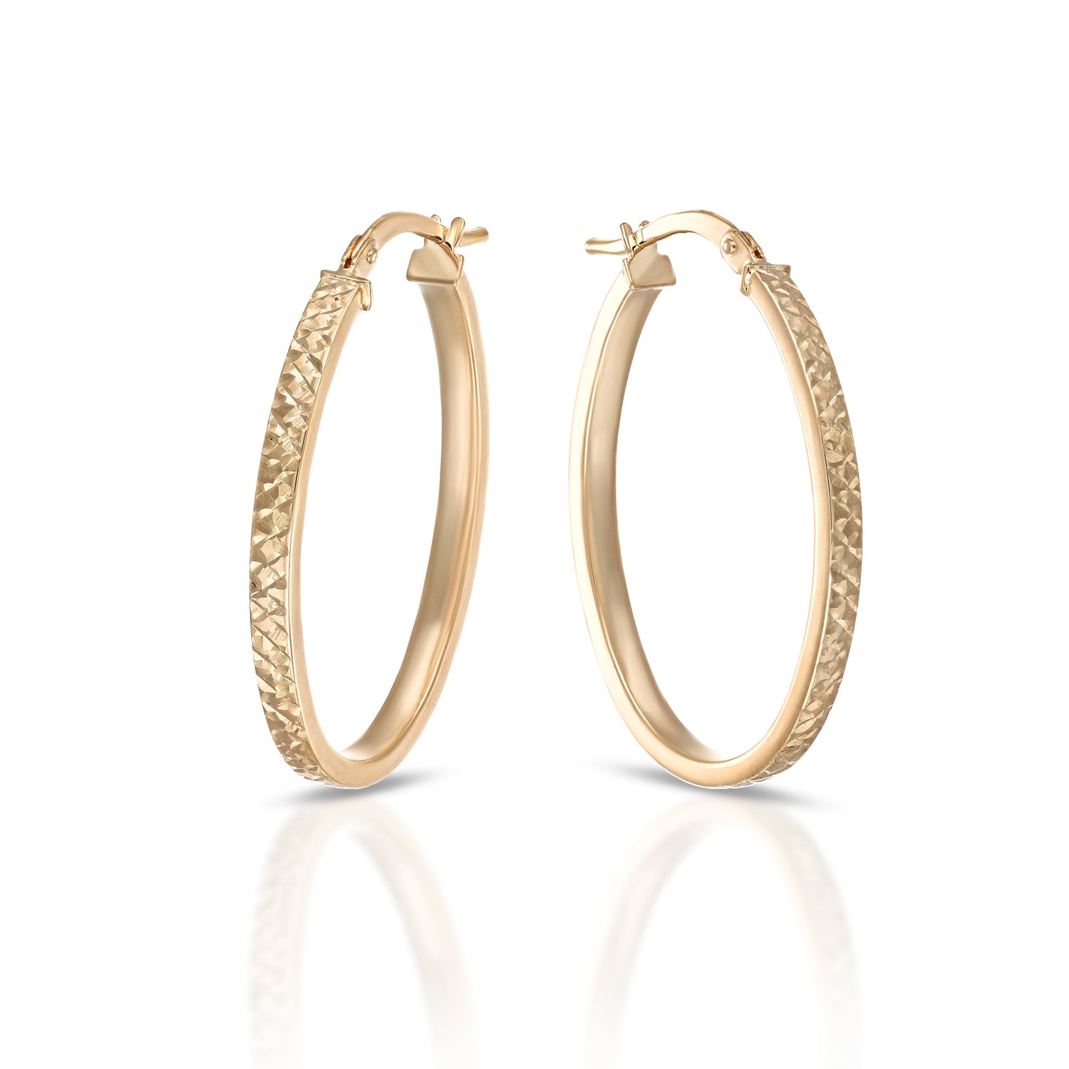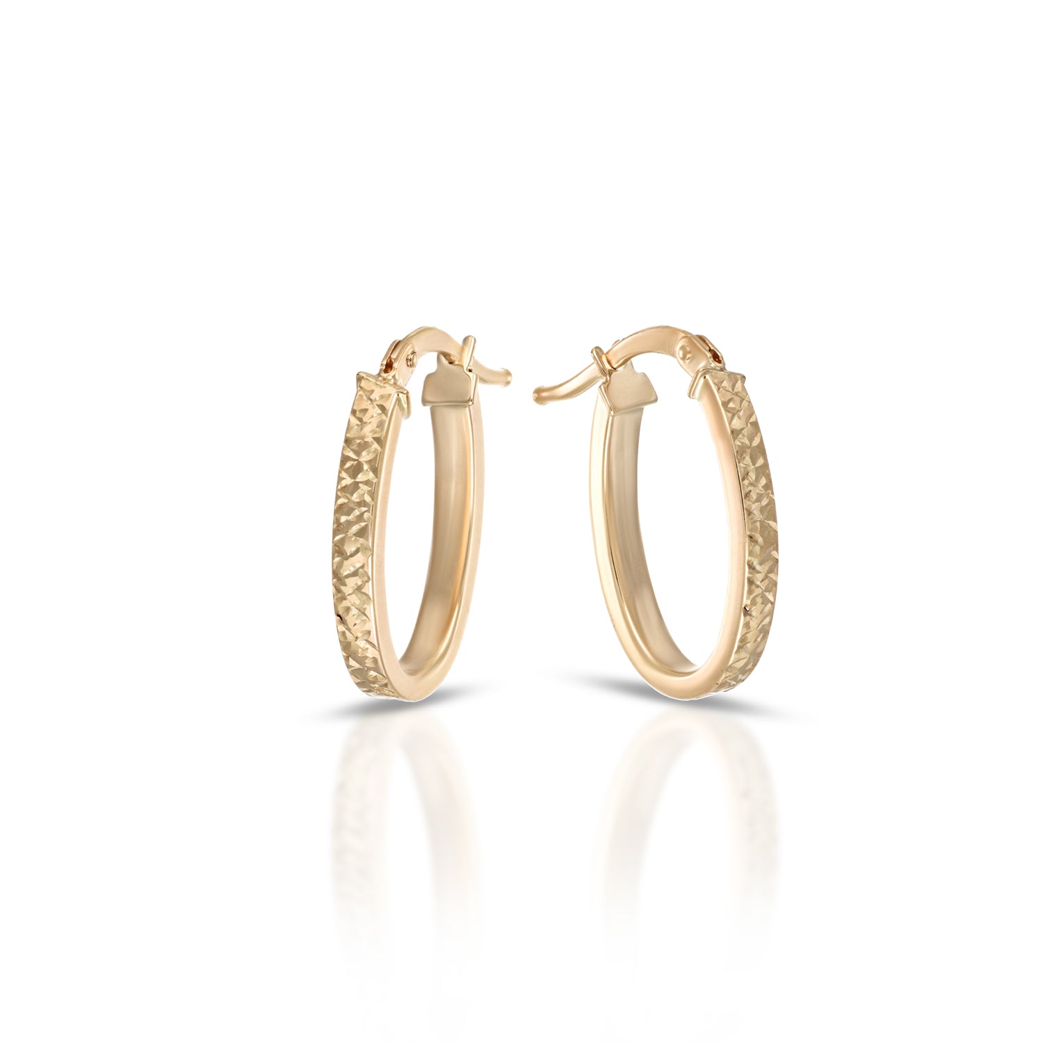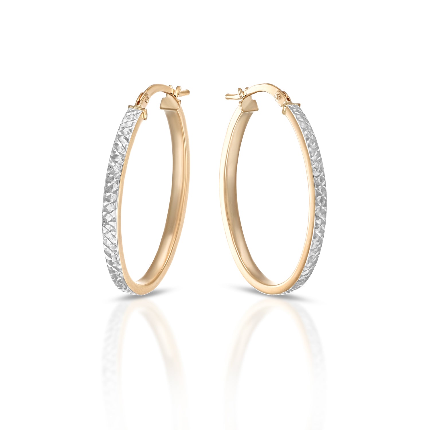 The Flat Collection transforms the classic hoop into a contemporary and distinctive piece of jewelry. The earrings feature a double oval or hoop design, with a 2.5 x 1.5 mm flat rectangular shank and a handcrafted diamond-cut front, capturing the light with unparalleled brilliance and sophistication.