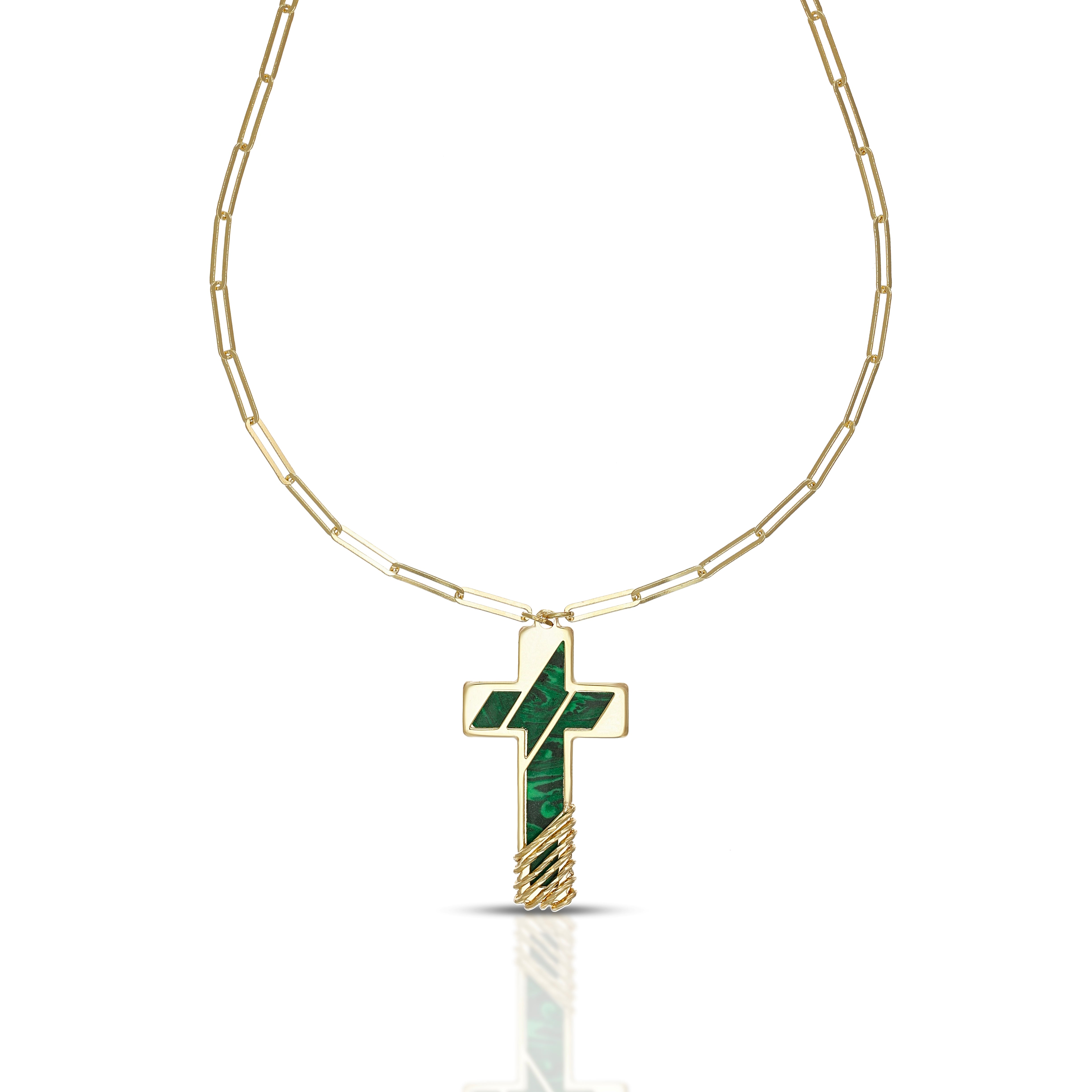 Collana versatile con croce in tre varianti di pregiato materiale: madreperla luminosa, onice profonda e malachite verde smeraldo.
