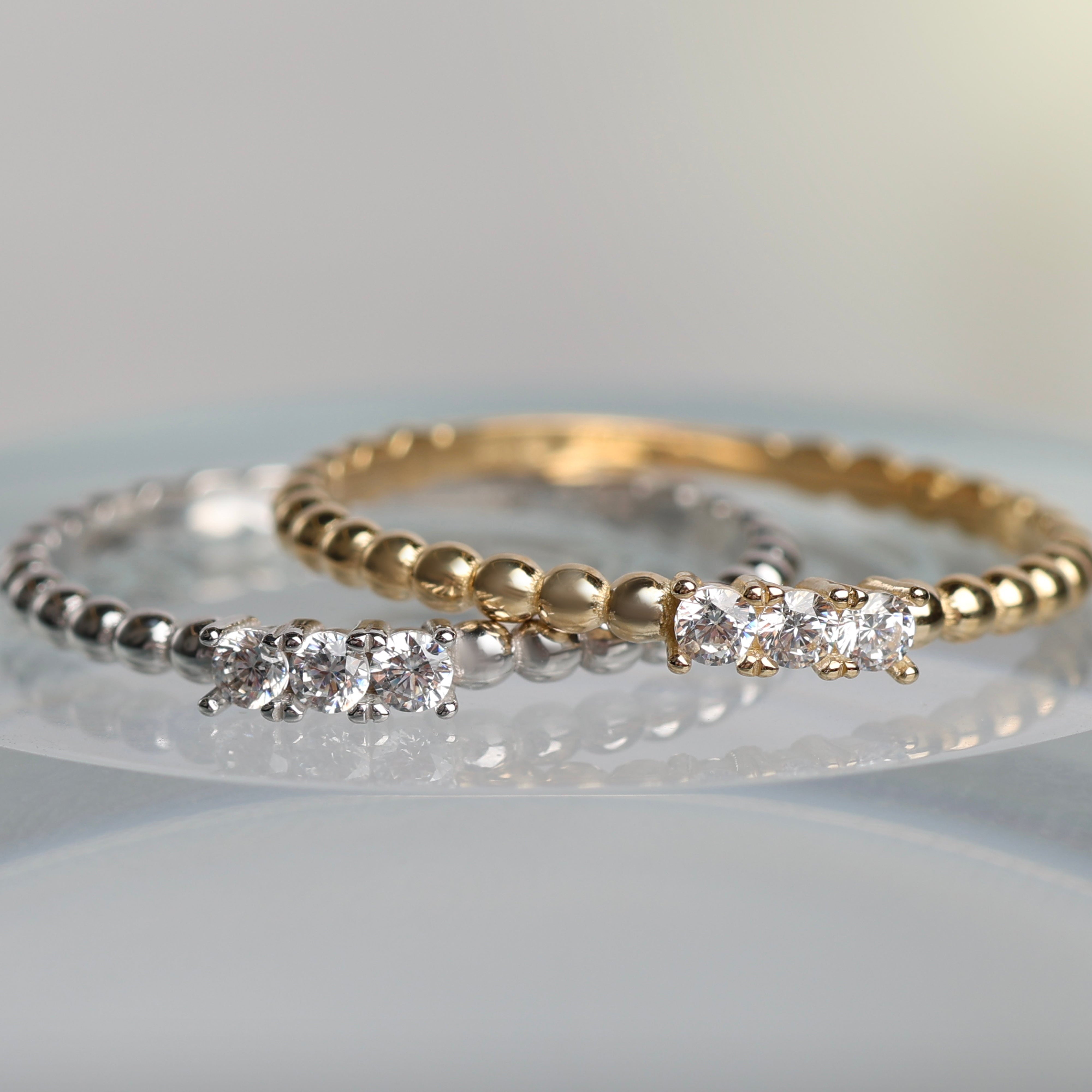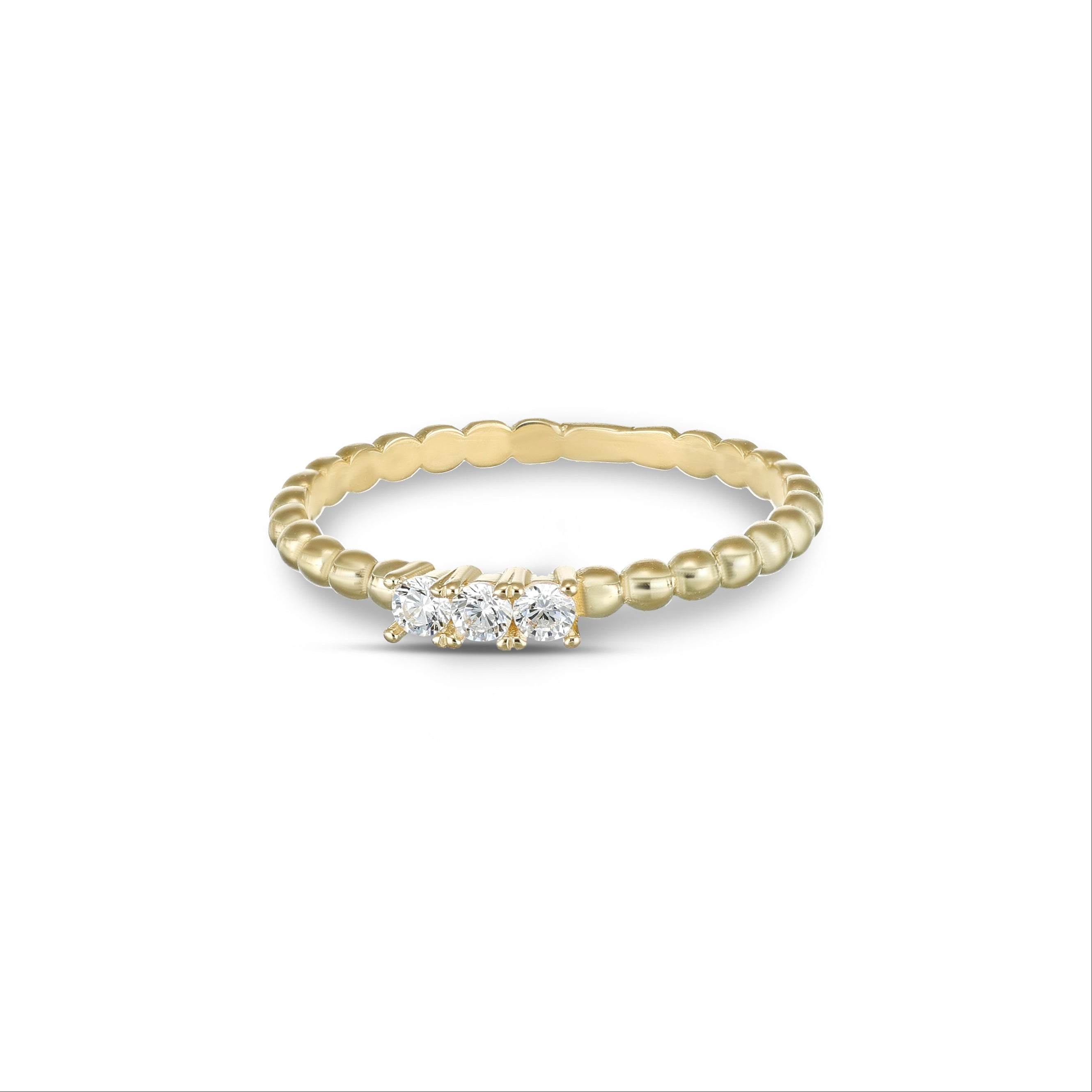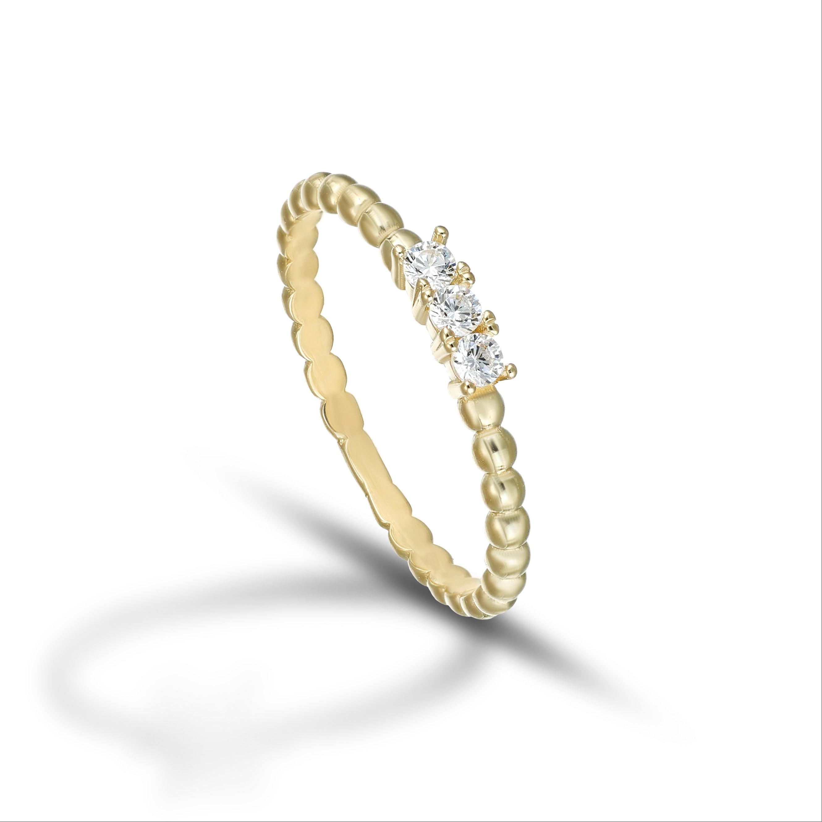 Questo anello trilogy in Oro 9 Carati di Dana unisce raffinatezza e simbolismo: i tre zirconi bianchi da 2 mm rappresentano il passato, il presente e il futuro, racchiusi in un design elegante e discreto.