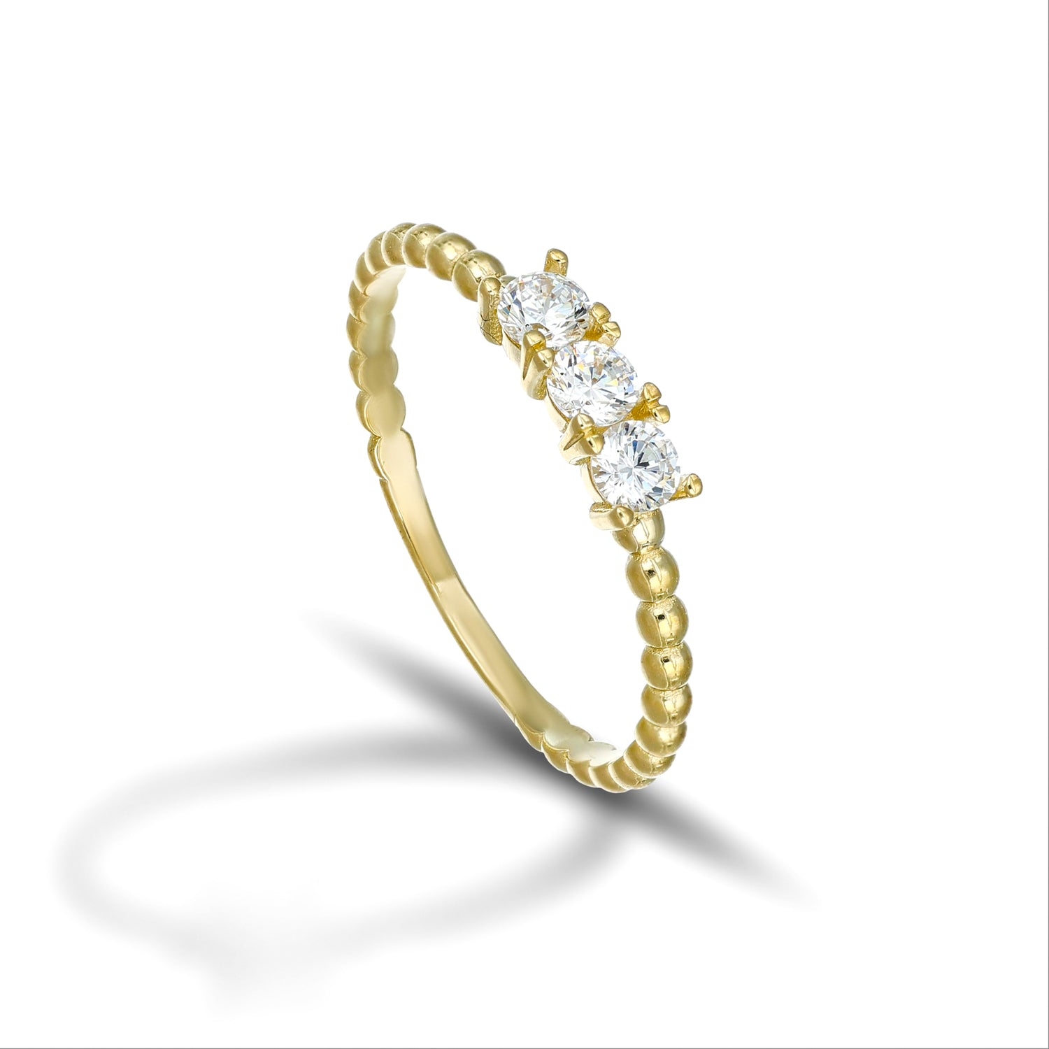 Questo anello trilogy in Oro 9 Carati firmato Dana è impreziosito da tre zirconi bianchi da 3 mm che regalano una luminosità decisa e avvolgente.