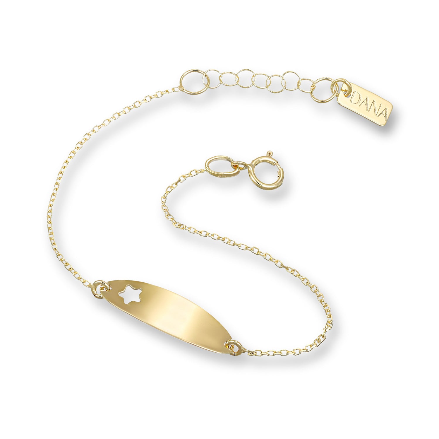 Bracciale in Oro 9 Carati con targa ovale da poter incidere e una piccola stella traforata... un regalo unico e personalizzato per celebrare la nascita di una nuova vita o un momento speciale. Un tocco divertente e grazioso per la tua bambina!