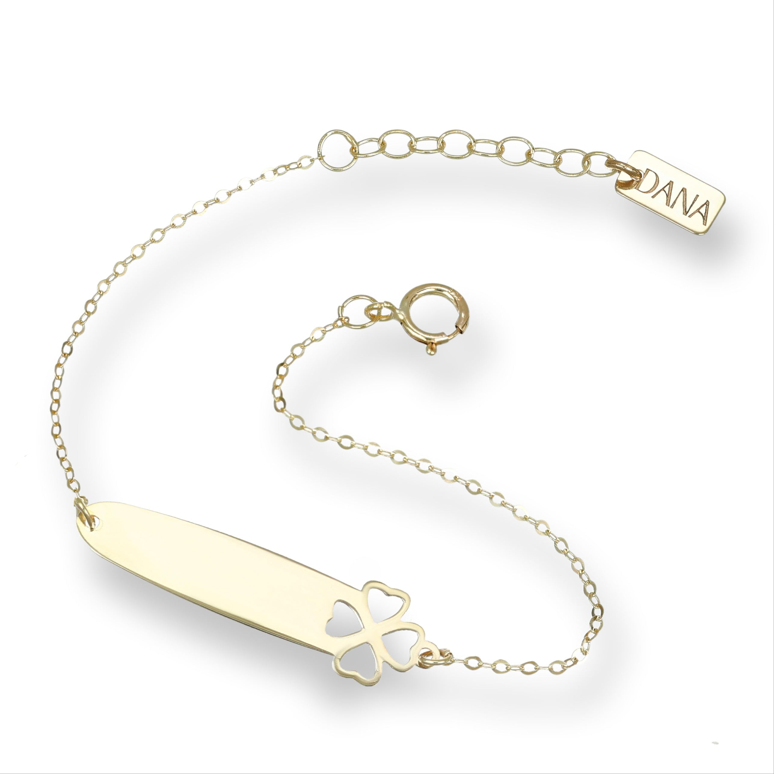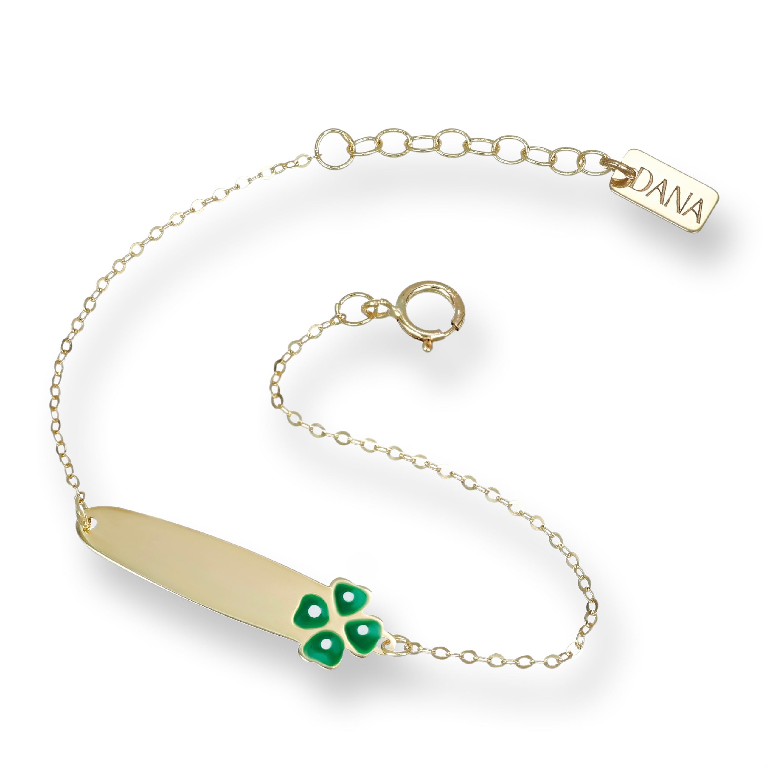 Aggiungi un tocco di fortuna al look del tuo bimbo con questo braccialetto in Oro 9 Carati. Rendilo unico incidendo un messaggio speciale. La lunghezza regolabile, 13 cm con estensione di 2 cm, lo rende adattabile a più età così da poterlo accompagnare in più tappe della sua vita.