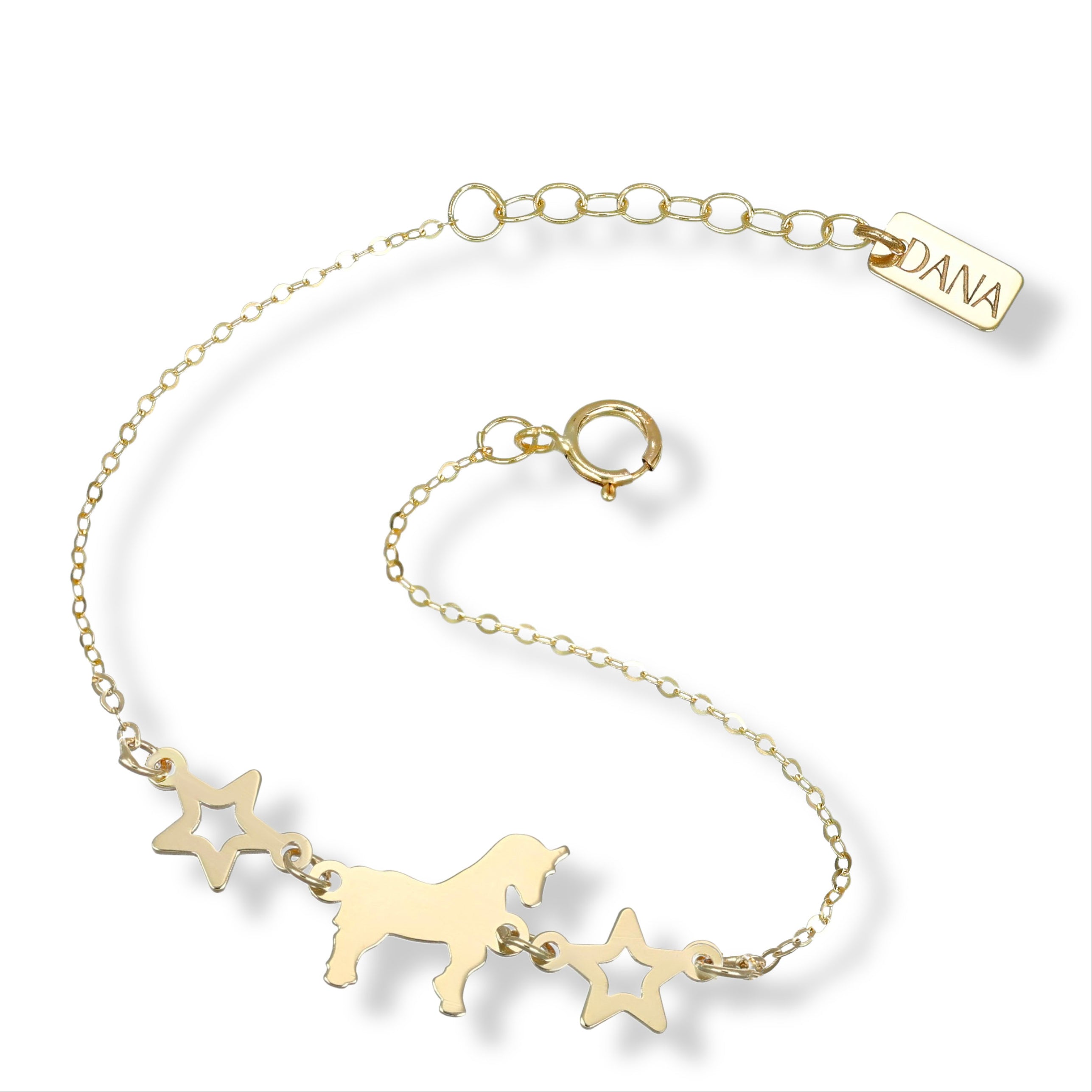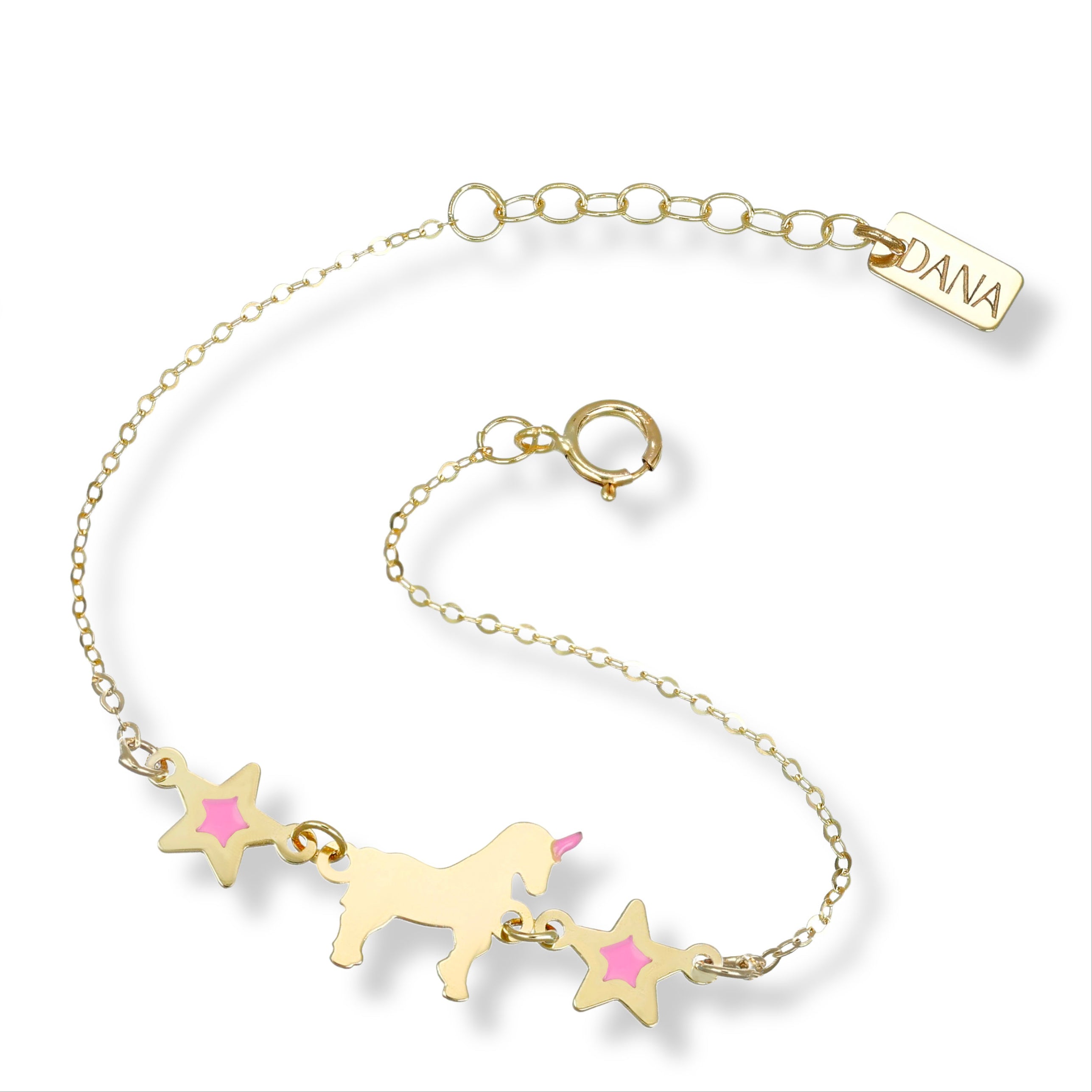 Aggiungi un tocco magico alla nuova nascita o al compleanno della tua bambina con questo braccialetto con unicorno e stelle. Il suo design unico è ispirato alle favole sarà sicuramente un regalo apprezzato. Indossare questo bracciale porterà sempre un po' di magia in più.