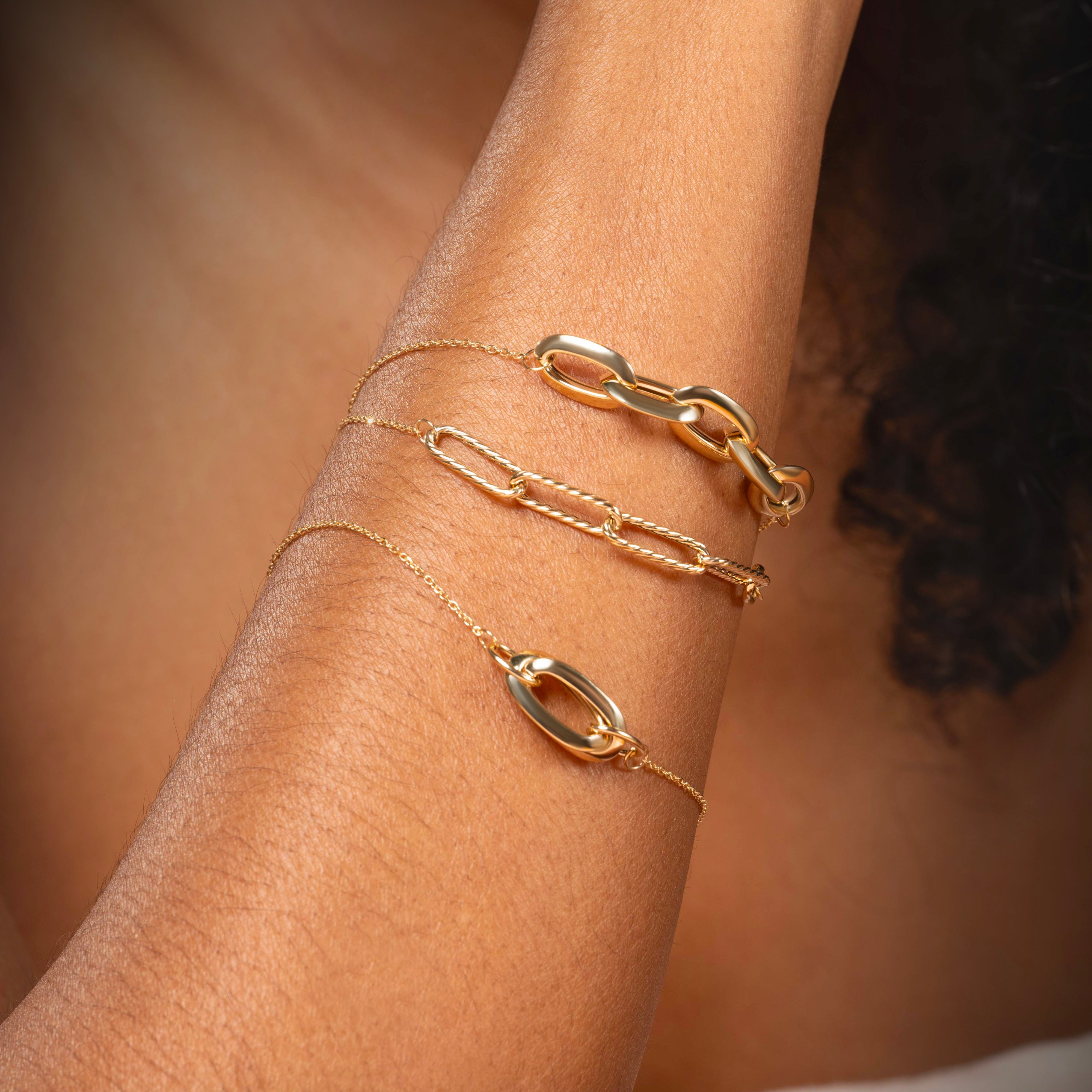 Il bracciale Anima Aurea in Oro giallo 9 Carati è un gioiello intriso di simbolismo e luce. Cinque ovali intrecciati con finitura lucida si susseguono al centro, evocando armonia, continuità e legami preziosi.