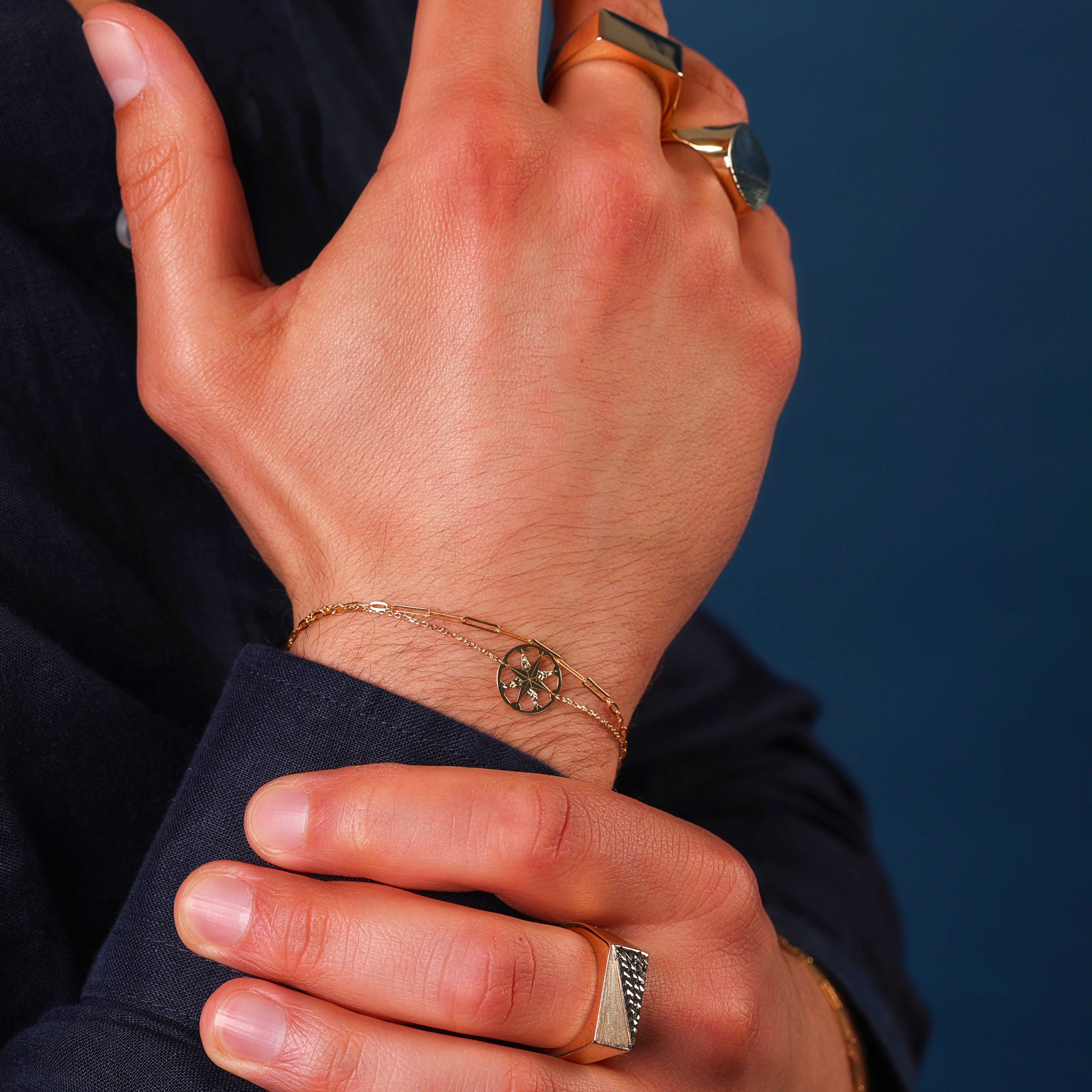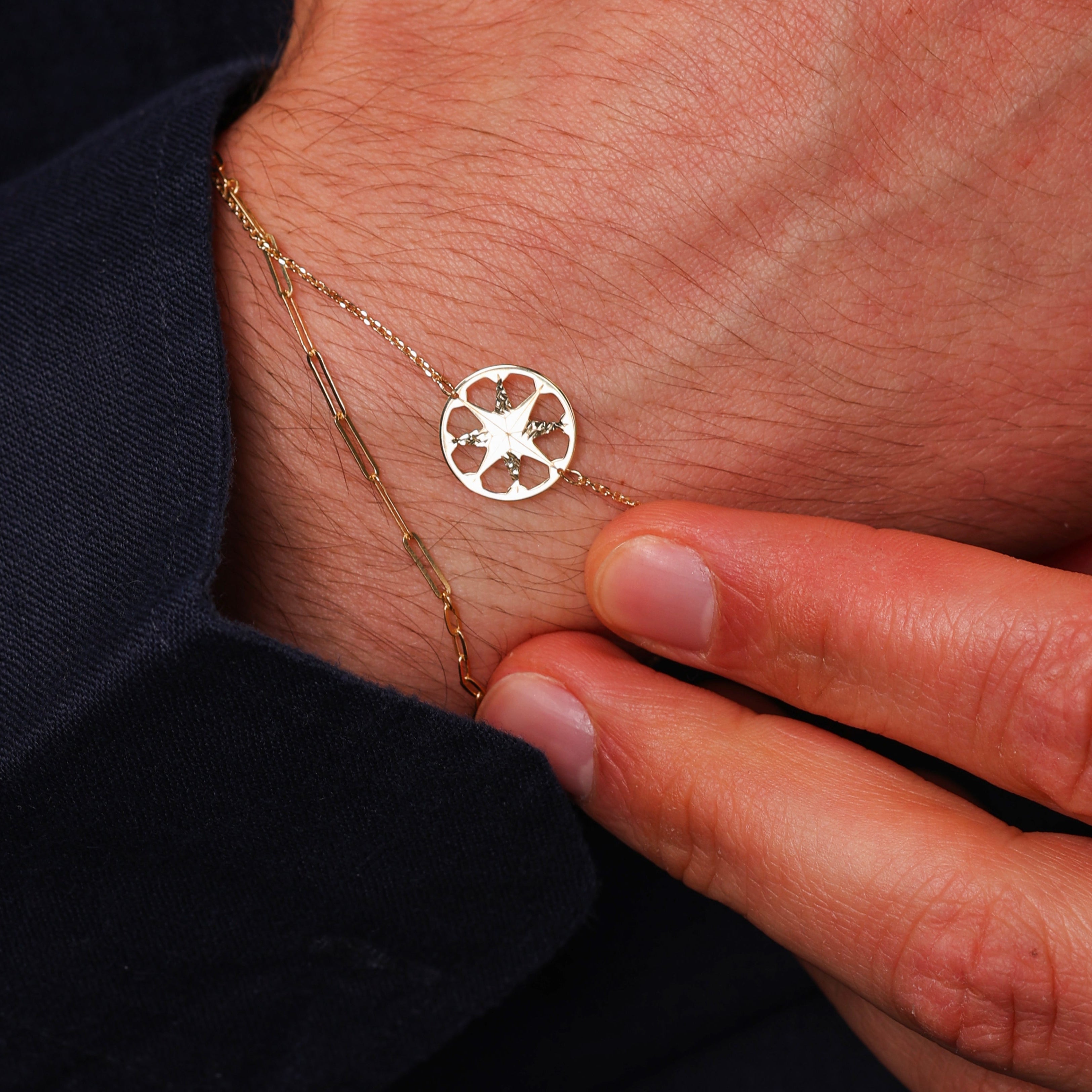 Il bracciale con rosa dei venti è un simbolo di orientamento e direzione, un richiamo alla costante ricerca di equilibrio e verità. La rosa dei venti, in questo caso realizzata con una finitura lucida e diamantata, cattura la luce e riflette la sua energia, simbolizzando il cammino verso i propri obiettivi.