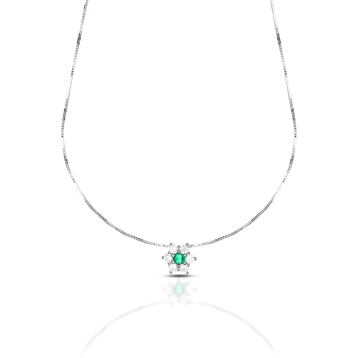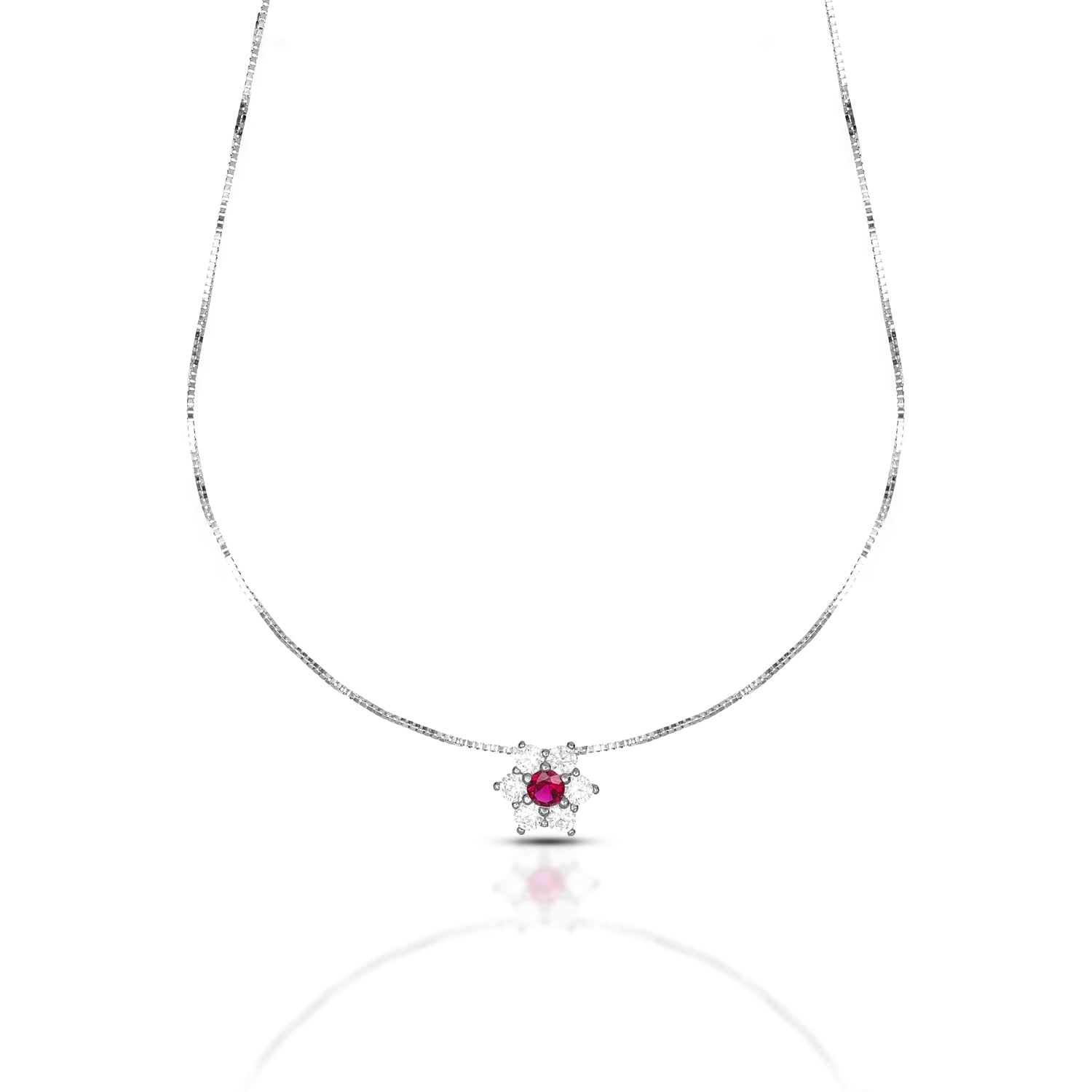 La collana Flora cattura la bellezza della natura in un gioiello raffinato e luminoso, realizzato in oro 9 carati. Il pendente a forma di fiore, arricchito con zirconi e pietre naturali nei toni del rosso, verde, blu e azzurro, illumina il décolleté con un tocco di eleganza moderna.