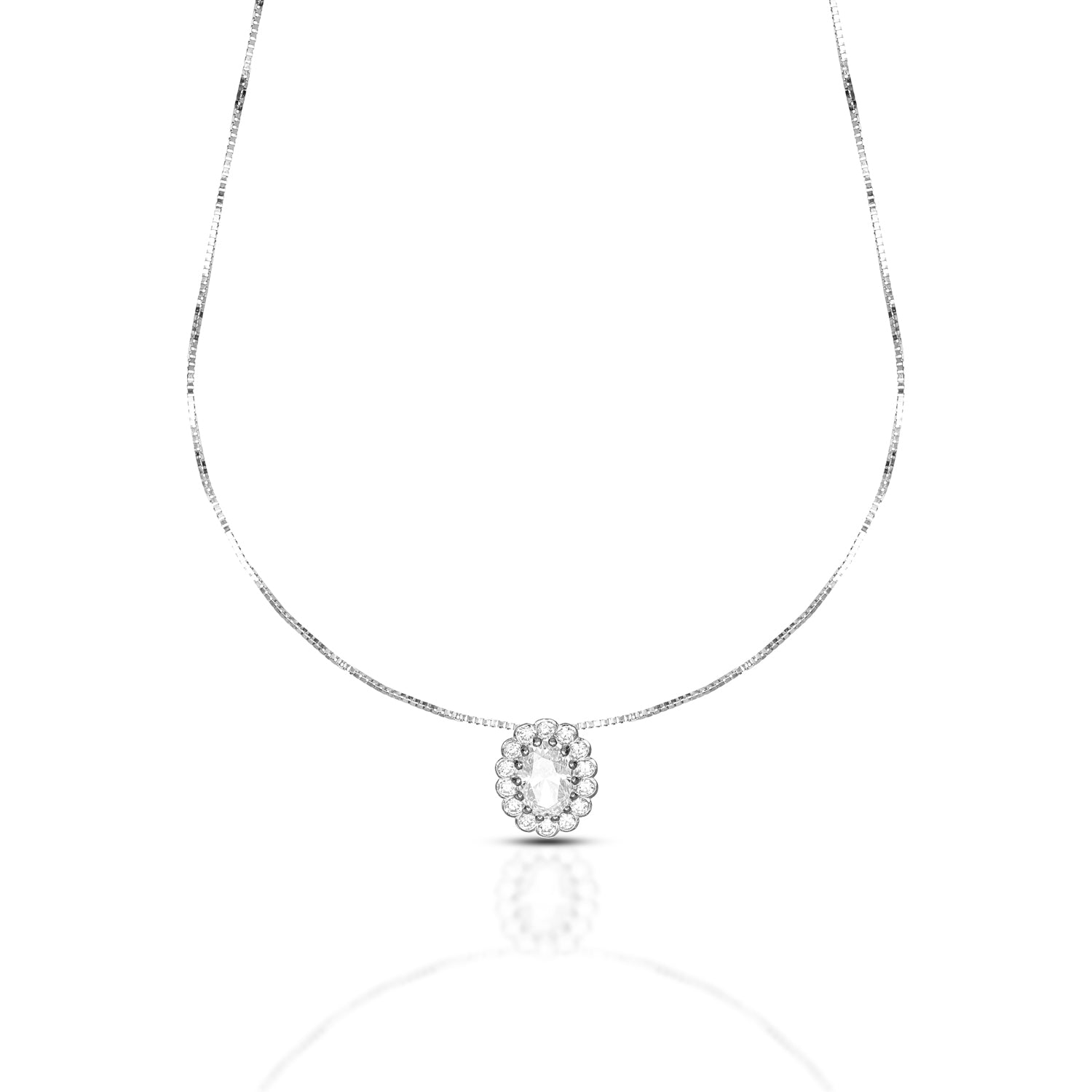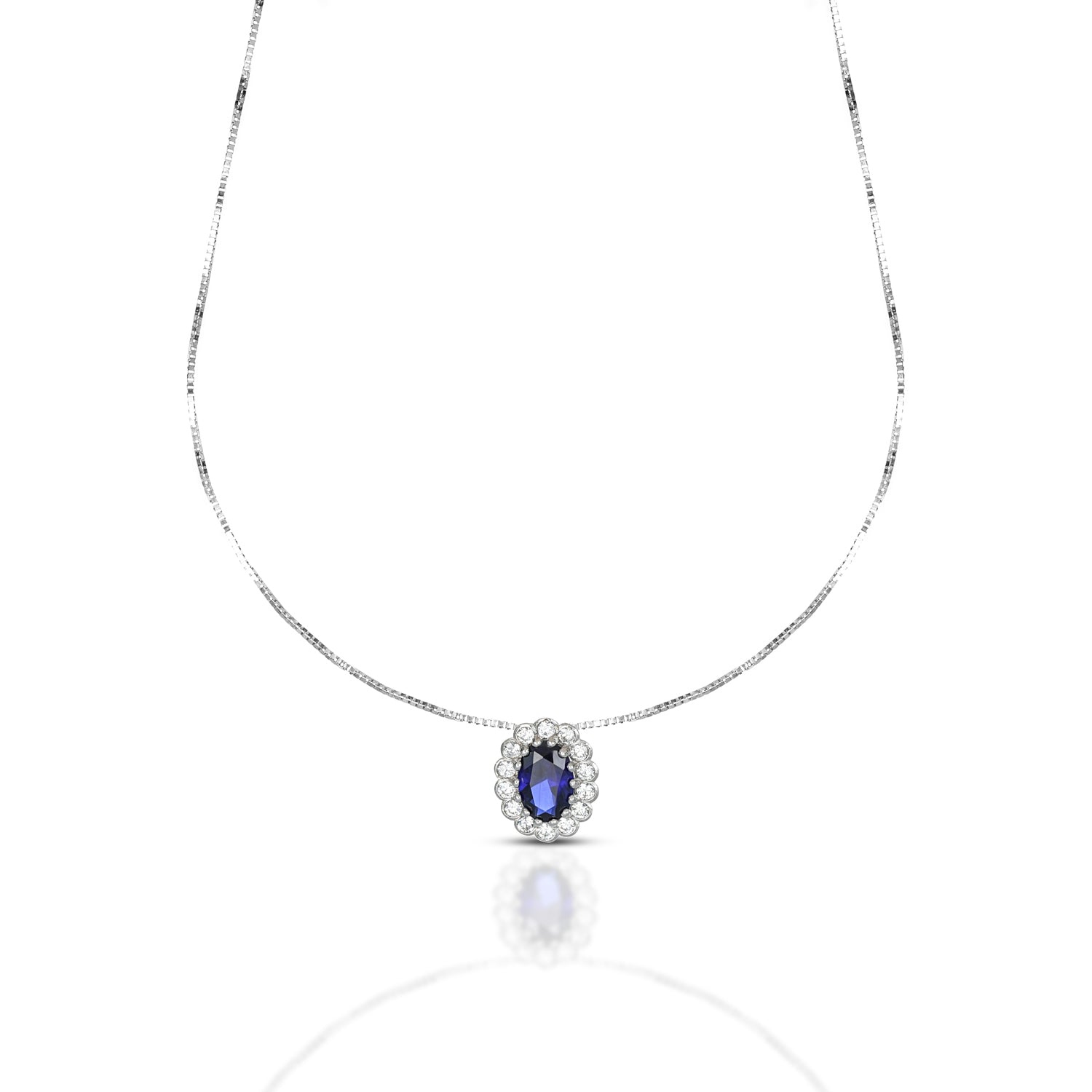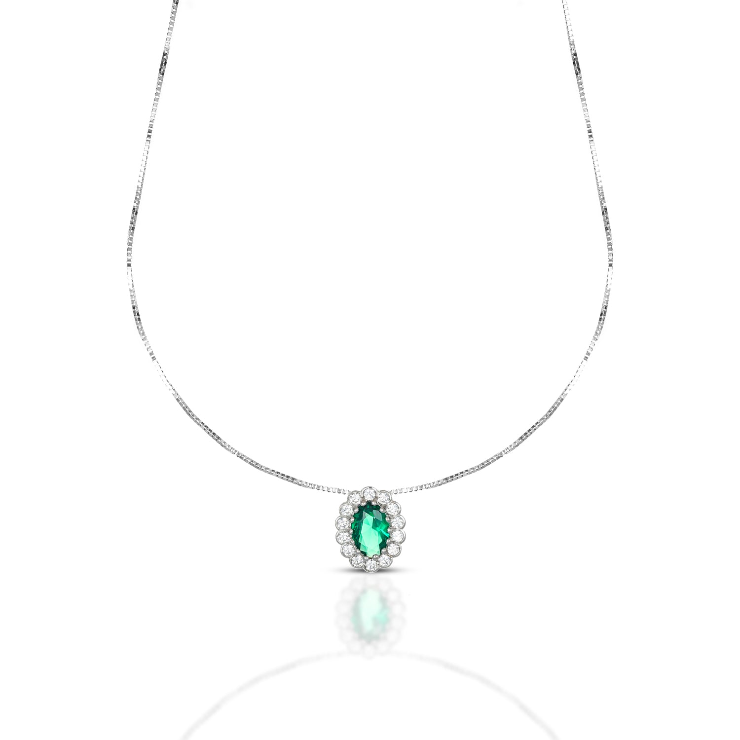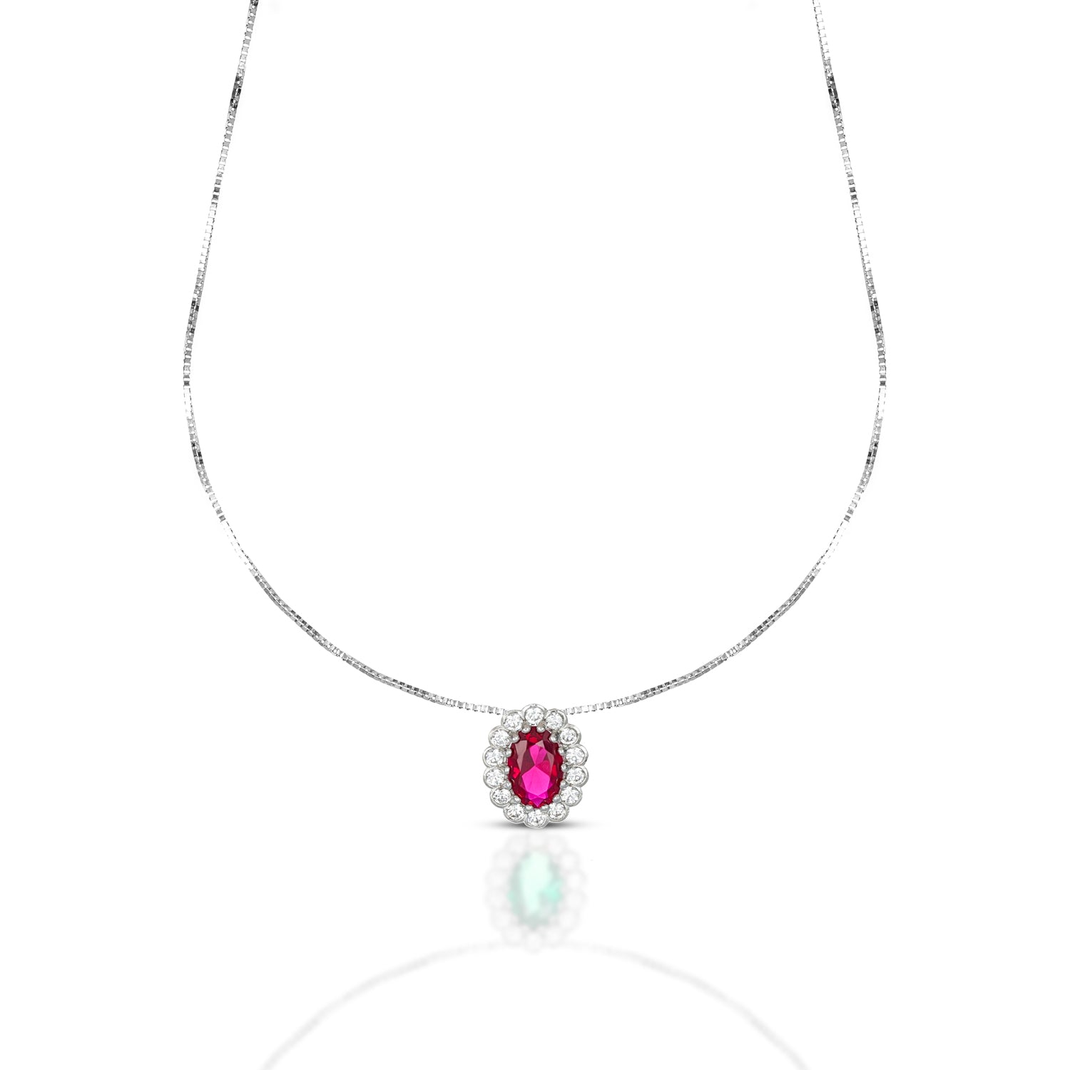 Realizzata in oro 9 carati, presenta un pendente ovale impreziosito da una pietra naturale non preziosa nei toni del bianco, rosso, verde, blu o azzurro, contornata da zirconi bianchi di alta qualità che ne amplificano la luminosità.