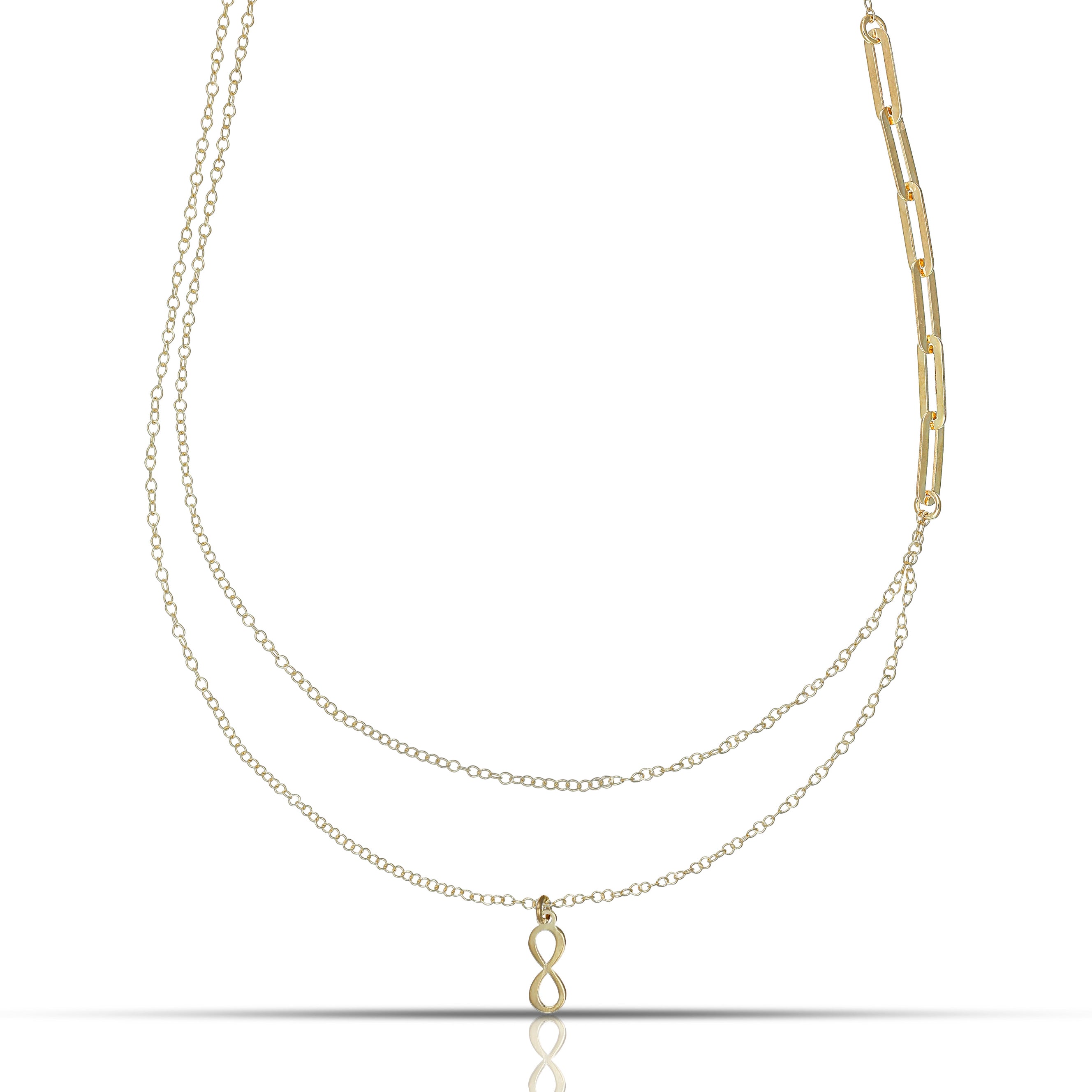 La collana Doppia Essenza – Infinito celebra l’eternità dei legami più profondi. Il ciondolo a forma di infinito, sospeso su una raffinata doppia catena in Oro 9 Carati, dona un tocco di significato e luce a ogni look. Perfetta da indossare ogni giorno o come regalo simbolico.