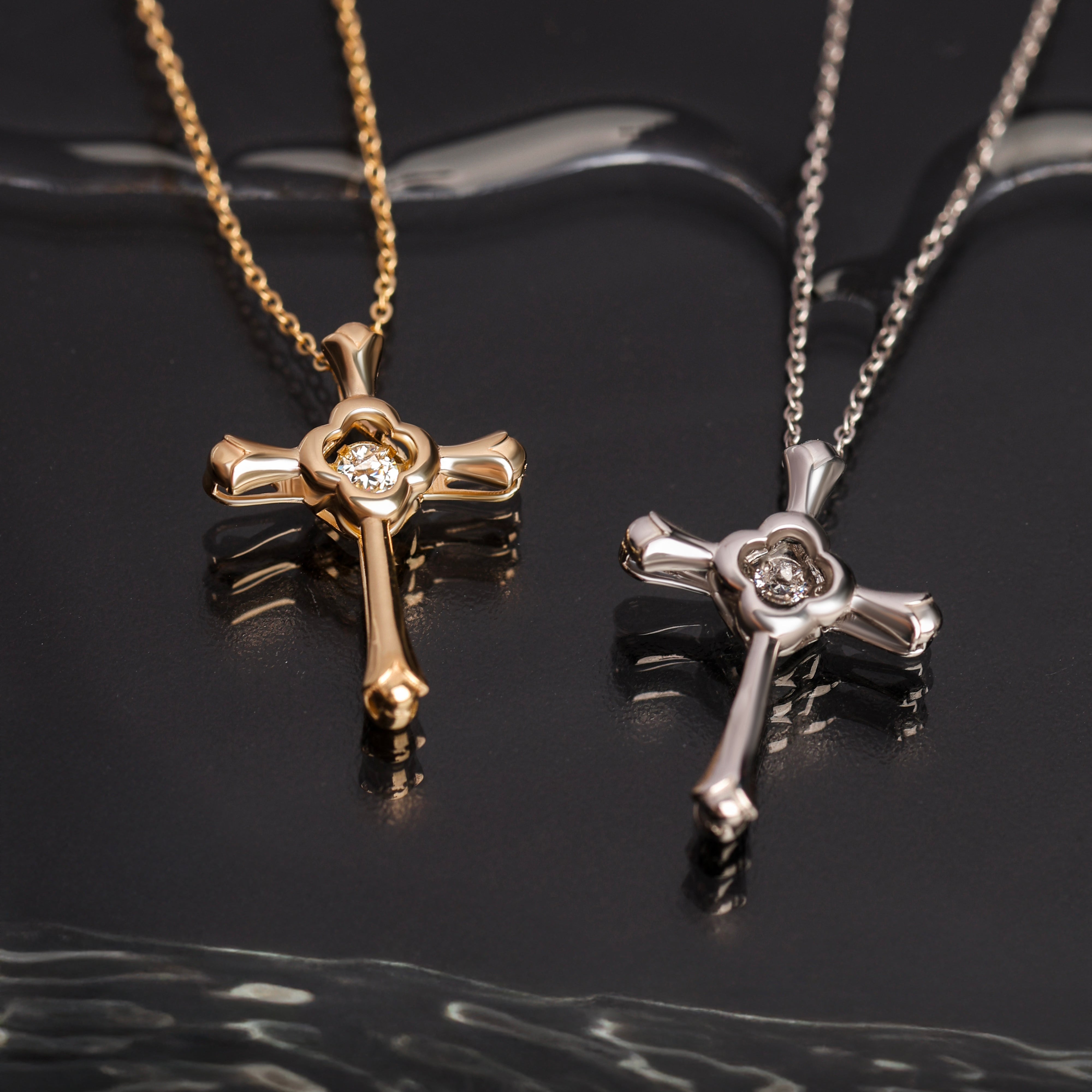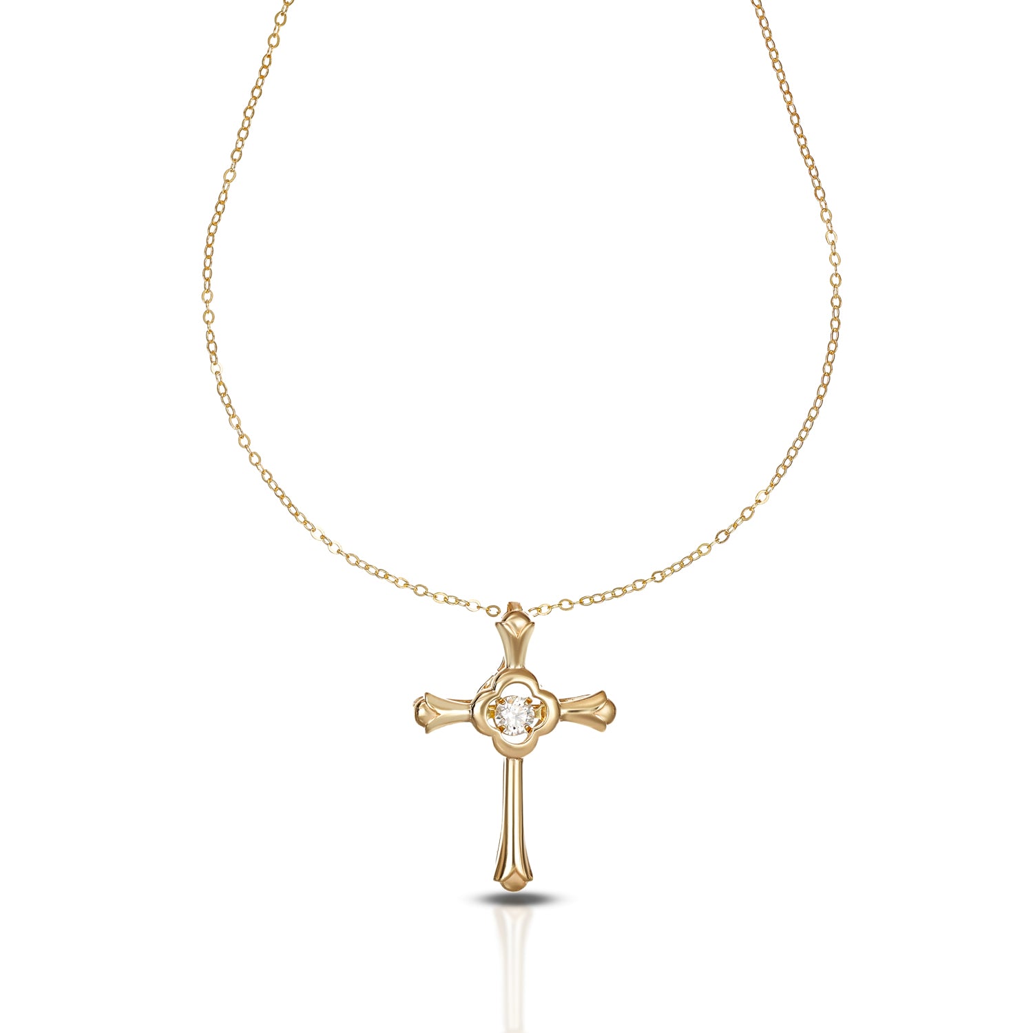 Simbolo senza tempo, la croce si veste di nuova luce con Eternelle. Una collezione che unisce linee stilizzate e moderne all’incanto di una pietra bianca danzante, capace di catturare ogni movimento e riflettere bagliori infiniti.