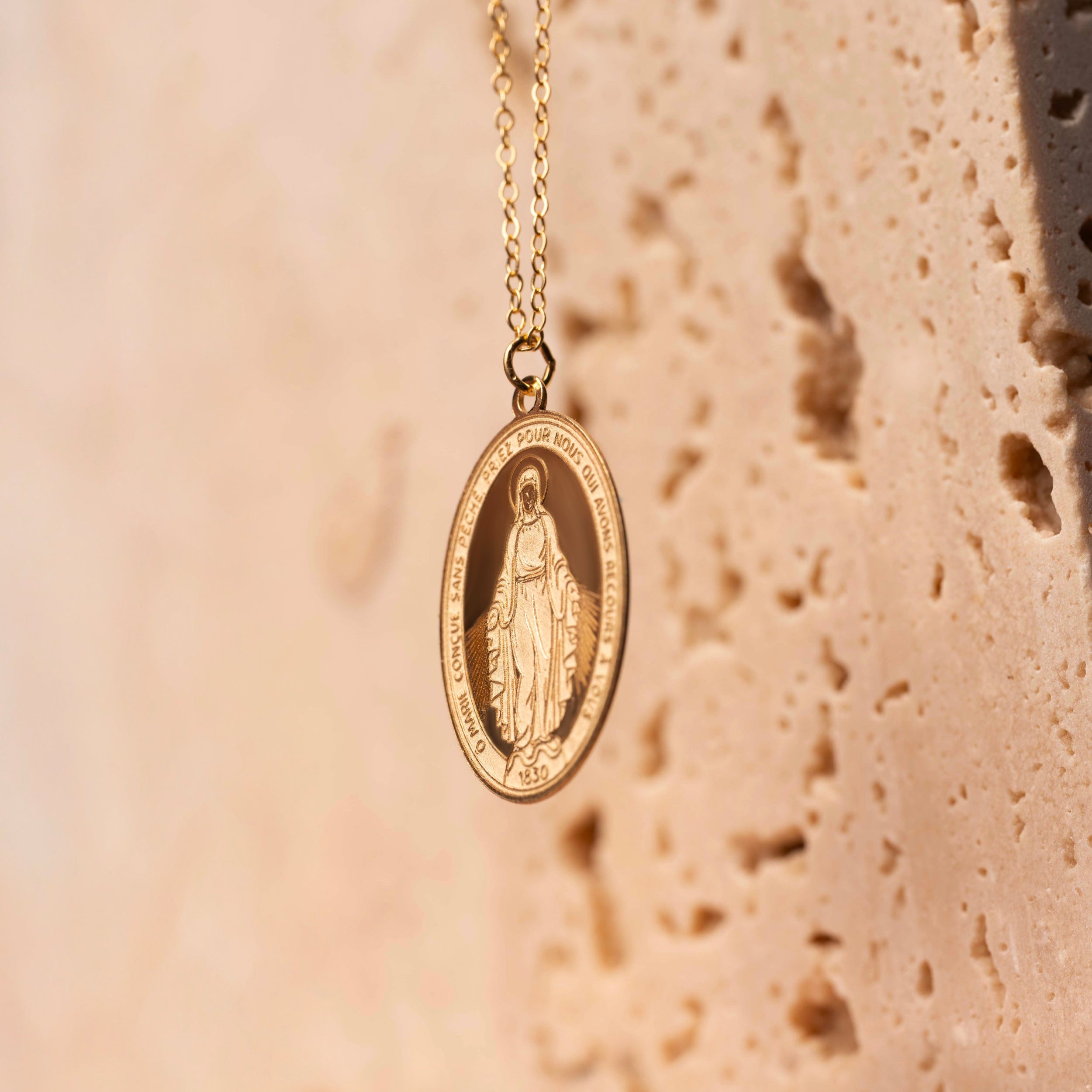Al centro, la Madonna Miracolosa, incisa con cura e rispetto, diventa simbolo di protezione e luce quotidiana.