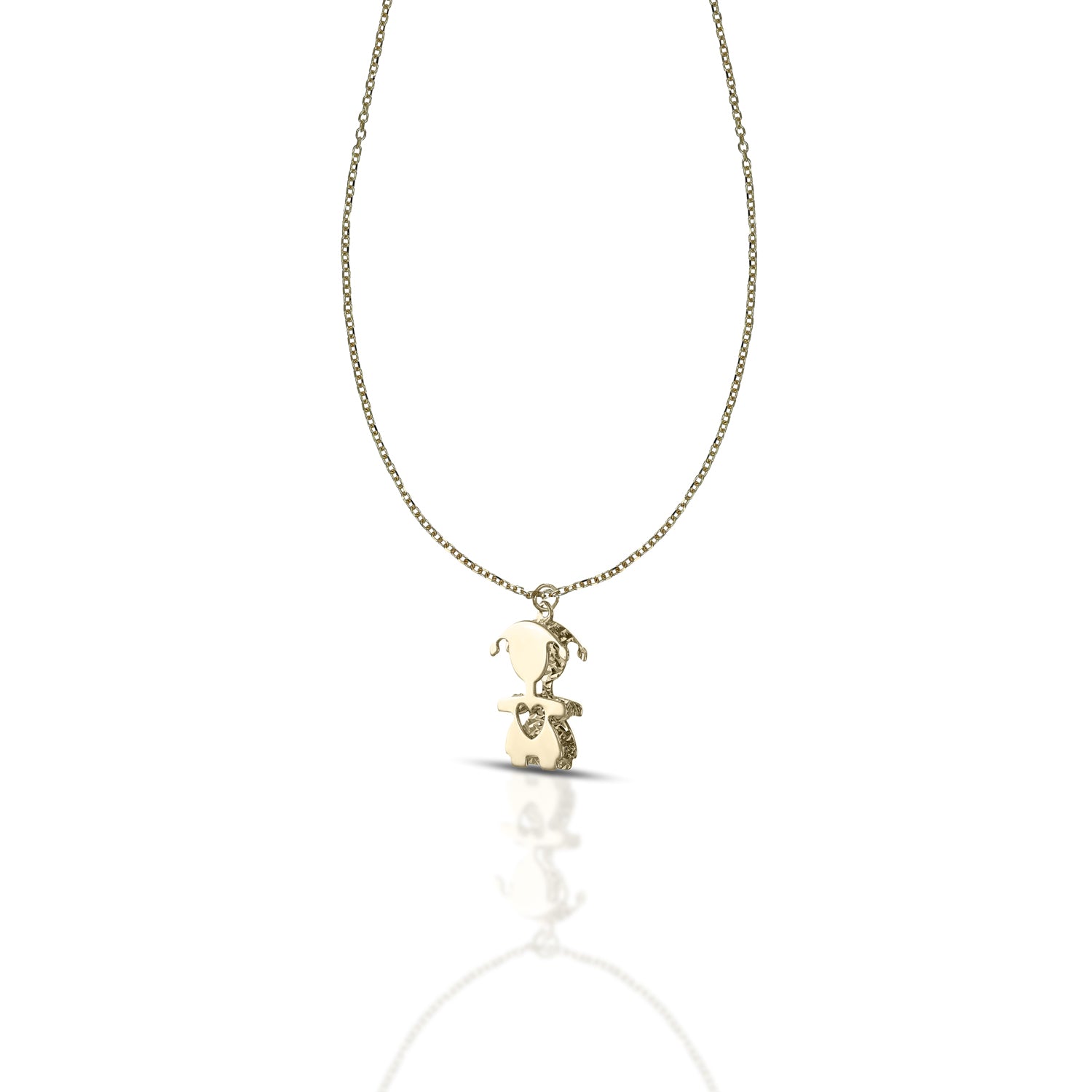 Disponibile in oro bianco o oro giallo, il gioiello presenta una finitura diamantata che dona luminosità e raffinatezza, mentre il cuoricino traforato al centro del corpo del bebè racconta l’intimità di un legame che va oltre le parole.