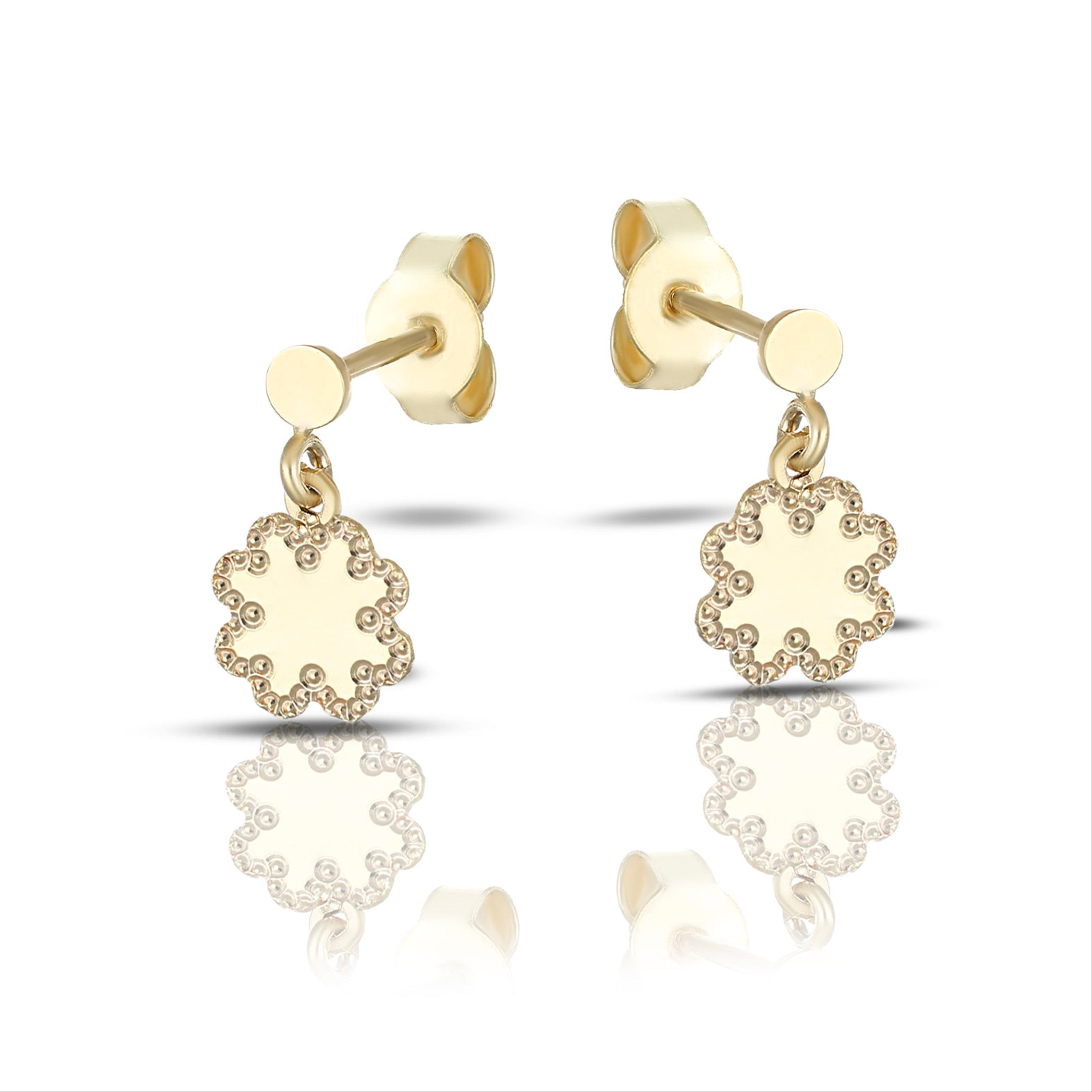 Alla moda fin da piccola! Questo è possibile grazie ai nostri orecchini pendenti in Oro 9 Carati con quadrifoglio e bordo diamantato. Il loro design unico crescerà con lei per essere sempre trendy e glamour.