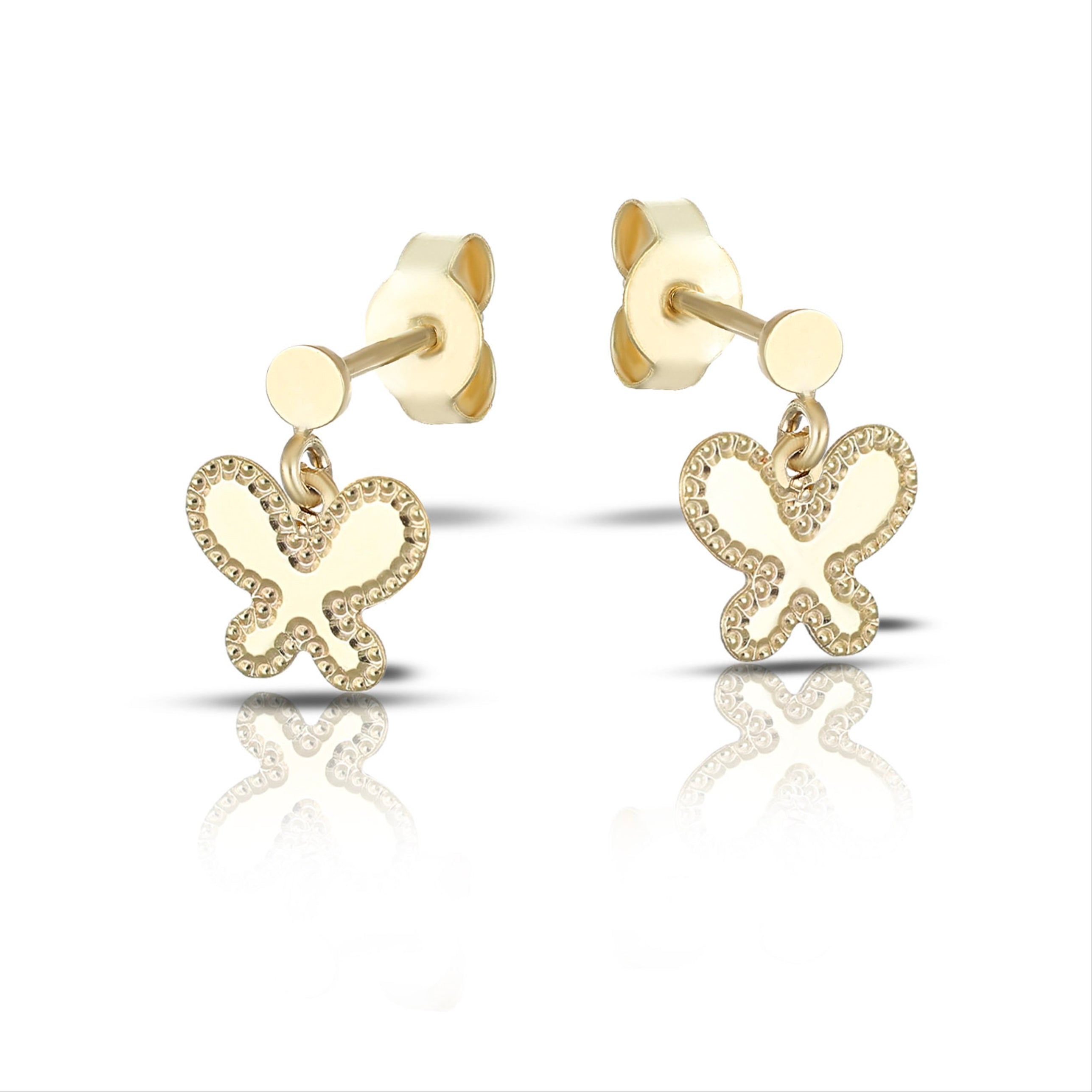 Alla moda fin da piccola! Questo è possibile grazie ai nostri orecchini pendenti in Oro 9 Carati con farfalla e bordo diamantato. Il loro design unico crescerà con lei per essere sempre trendy e glamour.