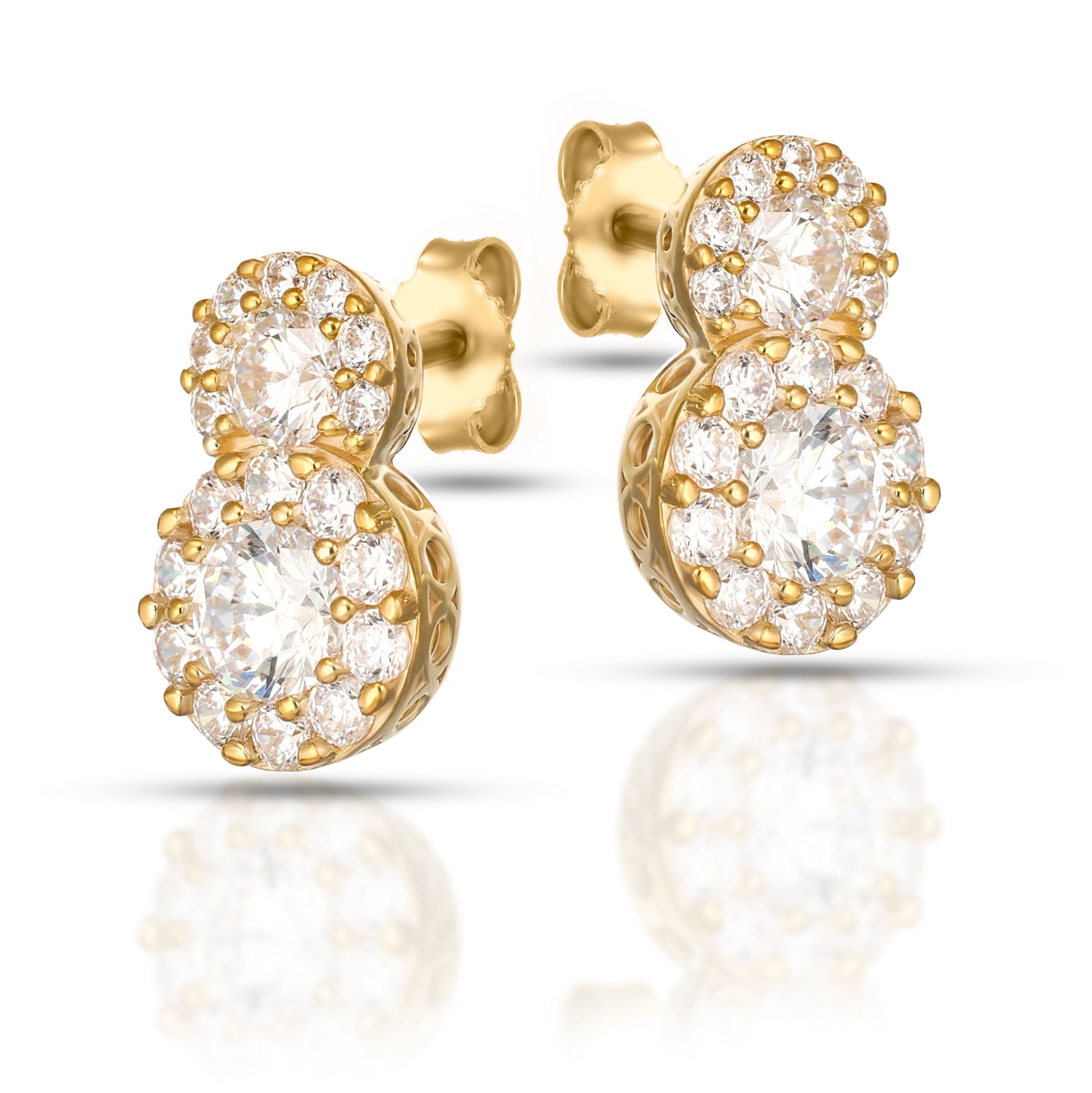 Realizzati in oro 9 carati, presentano un elegante doppio tondo impreziosito da zirconi e pietre naturali nei toni brillanti del bianco, rosso, verde e blu.
